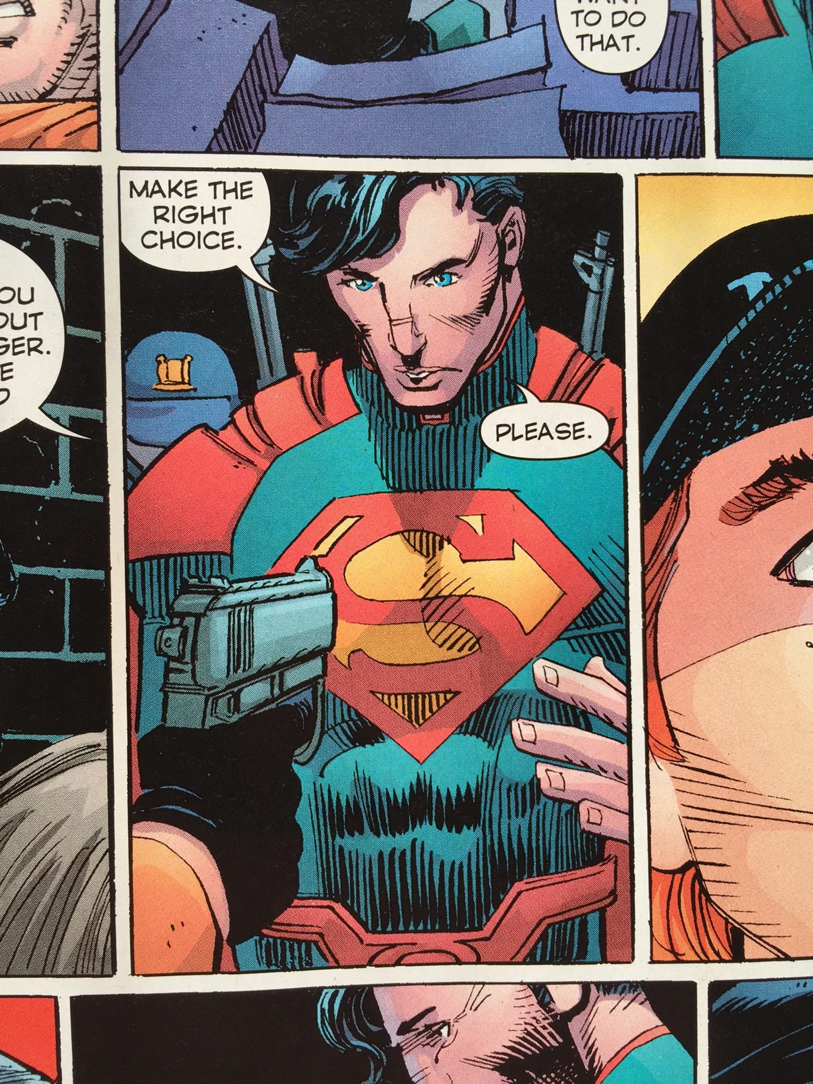And that's what made a good story become a story that I love. The best writers understand that what makes Superman is not that he's faster than a speeding bullet or more powerful than a locomotive. He simply tries to do the right thing even in the face of immense risk. It doesn't always work out. There are times when he fails, but he always keeps coming back to do the right thing. He doesn't step in front of guns because he's bulletproof. He steps in front of guns because he has the chance to help people. He would be Superman even if he didn't have the powers.